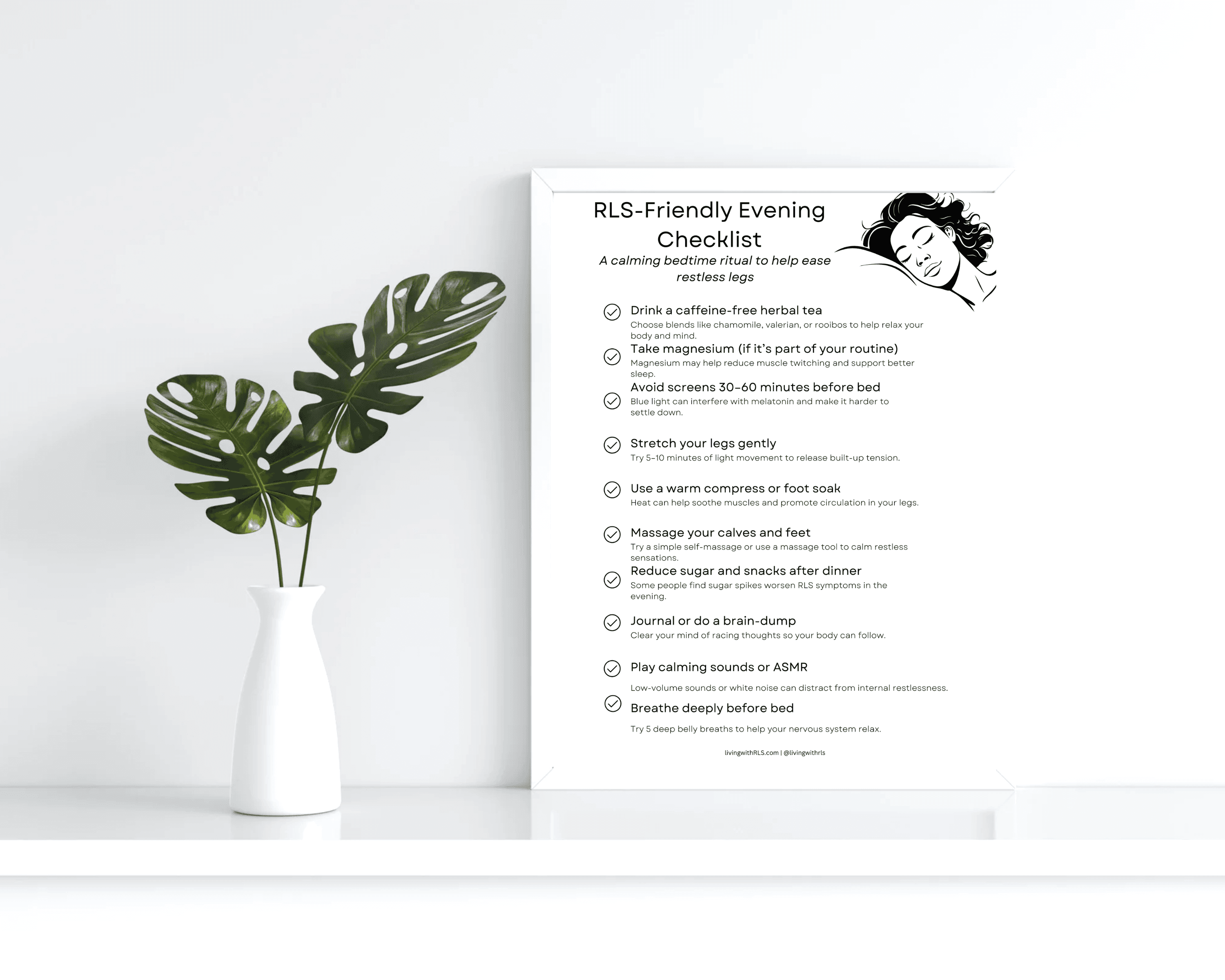 This printable RLS-Friendly Evening Checklist is designed to help you build a calming bedtime routine that may reduce nighttime restlessness and improve your sleep.